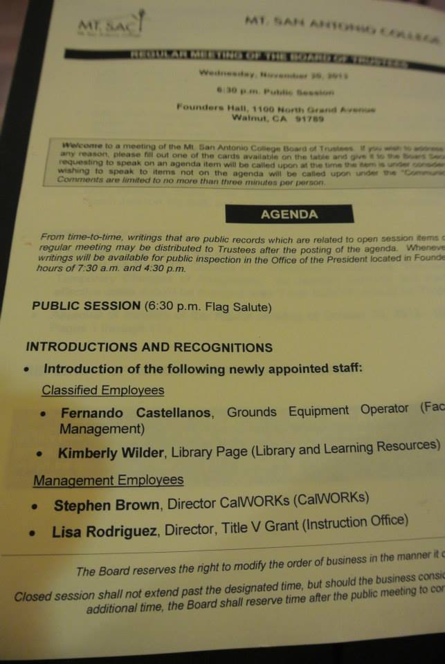 Tonight I had the opportunity to attend a board meeting at Mt. Sac and introduce myself to the board. I normally would not participate in anything that involves me talking about myself, but part of my homework for the EDD program is to attend a board meeting and observe the governance structure of a community college. Although it was technically cheating for me to go to a meeting at the school I work at, I am going to overlook that fact and check this one off the list.